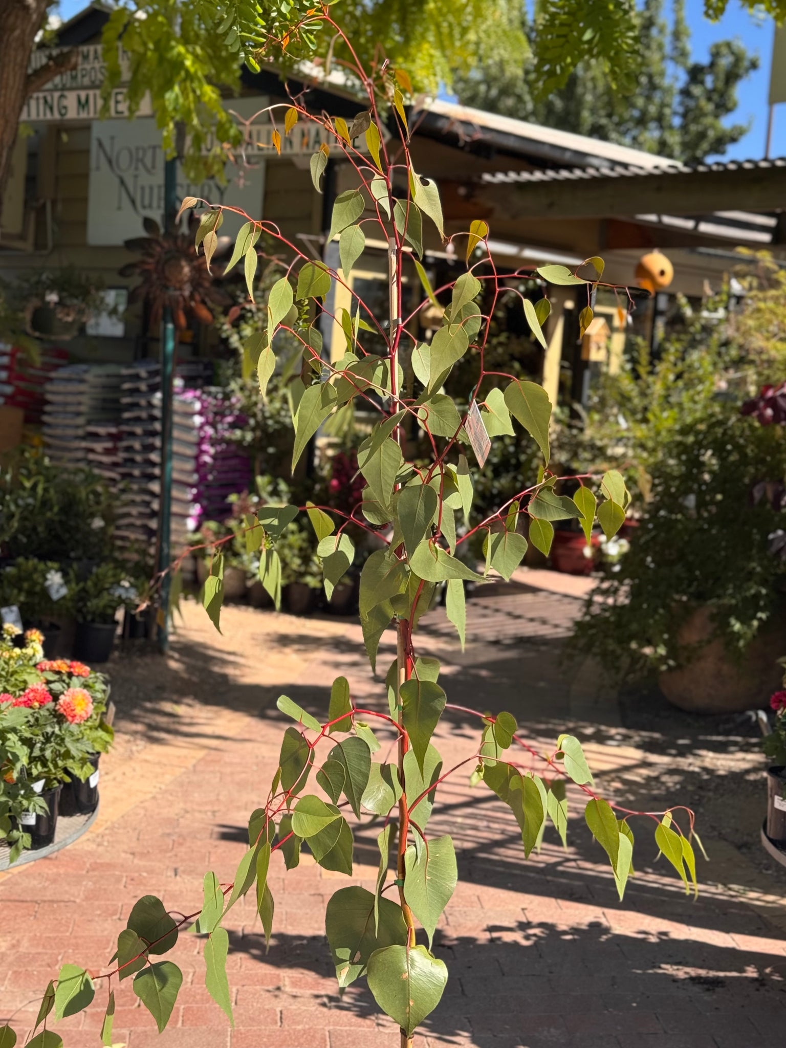 A very striking small tree with a weeping habit and attractive bark. Pendulous, white-coated branches carry a profusion of large pink to red flowers with yellow-tipped stamens in winter and spring.